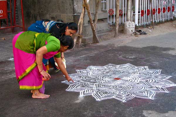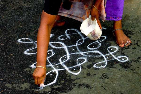 In general, it is women who draw rangoli needless of any devices such as a ruler, a thread, a brush, etc. to draw them. They freely move their fingers to create various shapes with no difficulty.