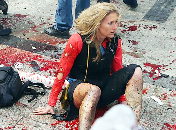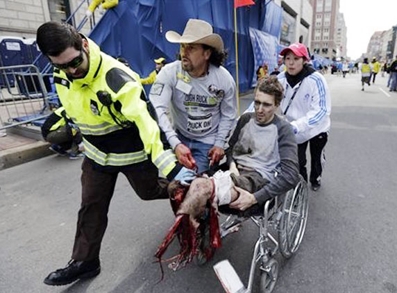 According to Joe Anderson, 33, a fisherman from Pembroke, Massachusetts, who had just run the race holding a large U.S. flag. A Rhode Island state trooper he saw people who looked like they had their legs blown off and that there was a lot of blood over their legs. Then people were being pushed in wheelchairs, while body parts scattered the scene. Absolute shockingly these runners just finished and they don't have legs now as been continued by Roupen Bastajian.