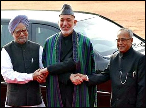 Prime Minister Manmohan Singh along with  Afghan President Hamid Karzai and President  Pranab Mukherjee