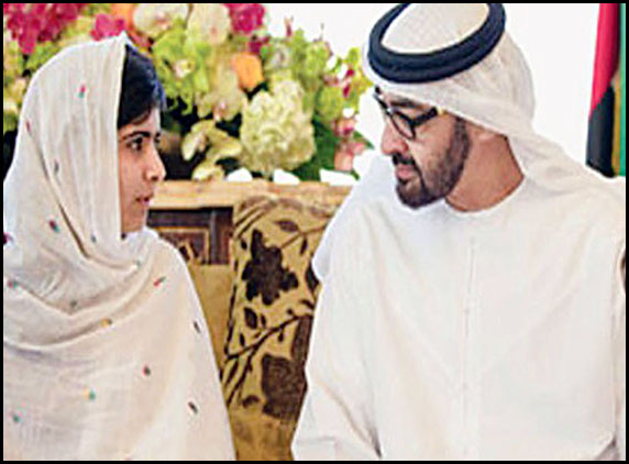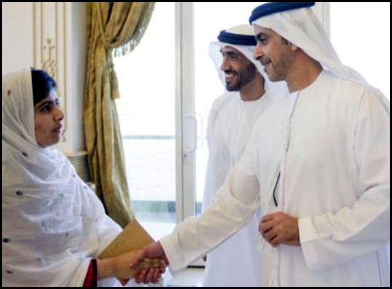 General Shaikh Mohammed bin Zayed Al Nahyan, Crown Prince of Abu Dhabi and Deputy Supreme Commander of the UAE Armed Forces, on Monday received at Al Bahr Palace Pakistani girl, Malala Yousafzai, who was attacked last year in her village of Mingora, over calling for girls' education.