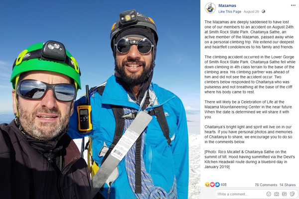 “The climbing accident occurred in the Lower Gorge of Smith Rock State Park. Chaitanya Sathe fell while down climbing in 4th class terrain to the base of the climbing area. His climbing partner was ahead of him and did not see the accident occur. Two climbers below responded to Chaitanya who was pulseless and not breathing at the base of the cliff where his body came to rest. Chaitanya’s bright light and spirit will live on in our hearts…”